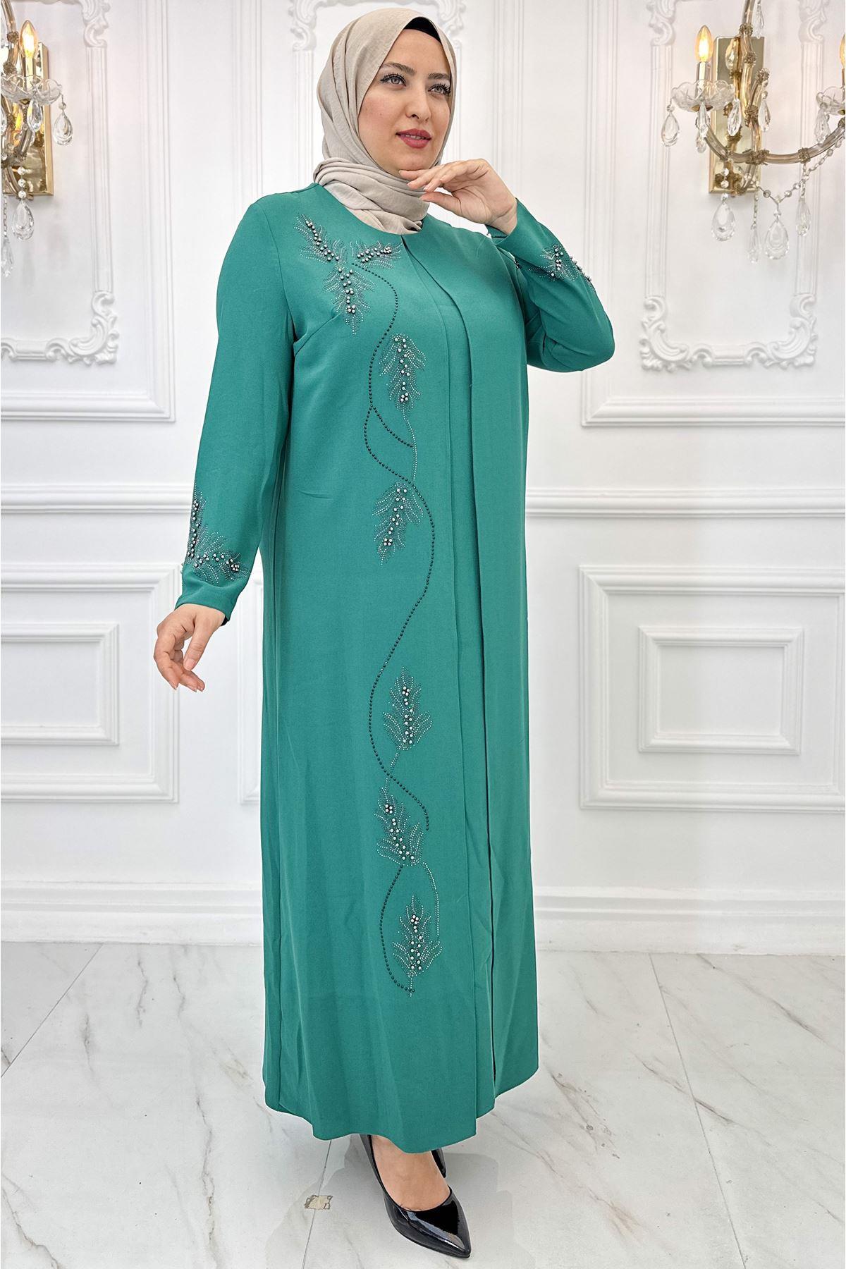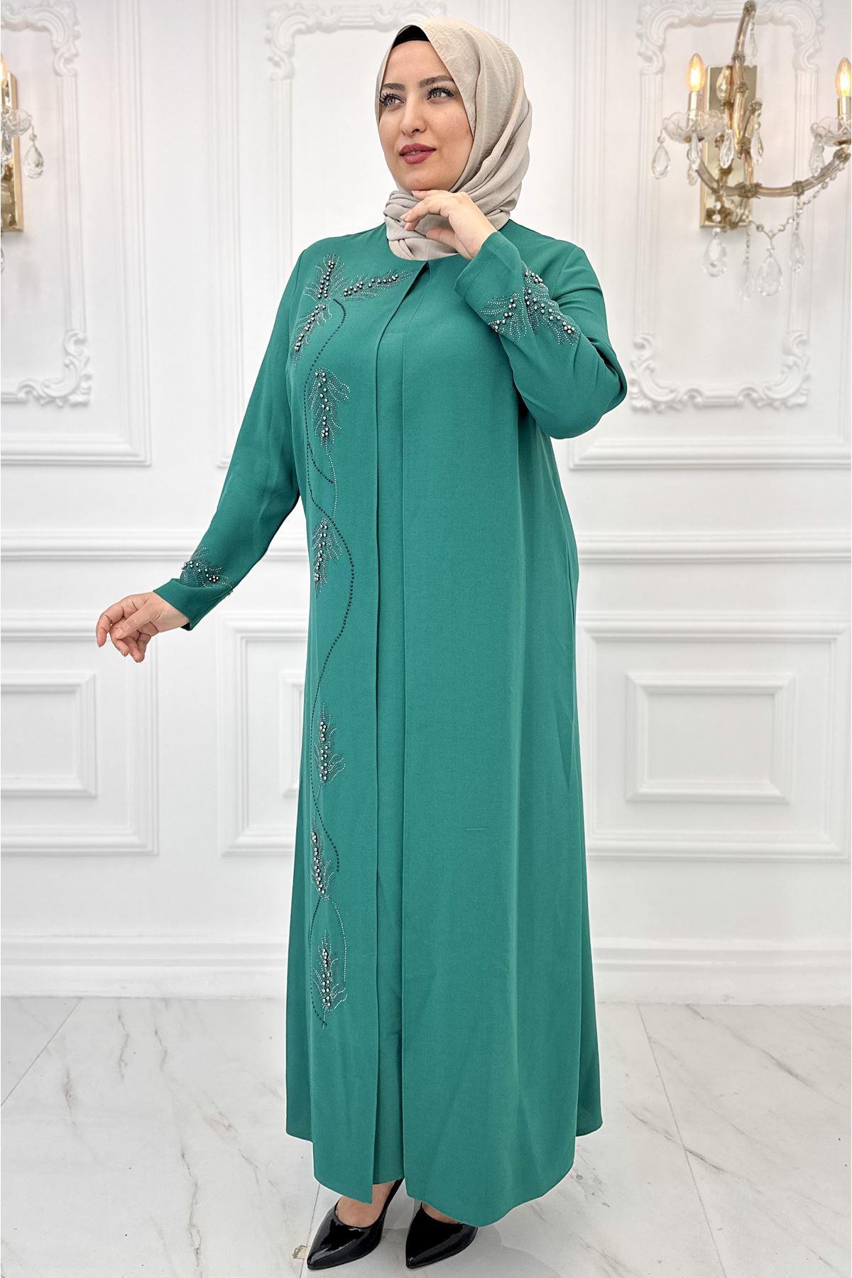 Ürün Özelliği: Tek parça abiye / Yaka ve üst kollar taş detaylıdır / Arkadan gizli fermuarlıdır.