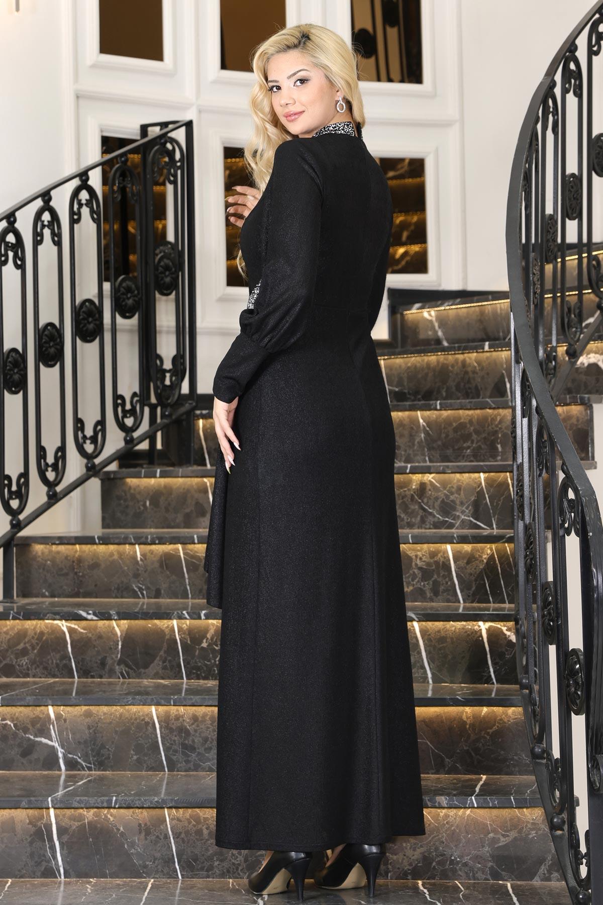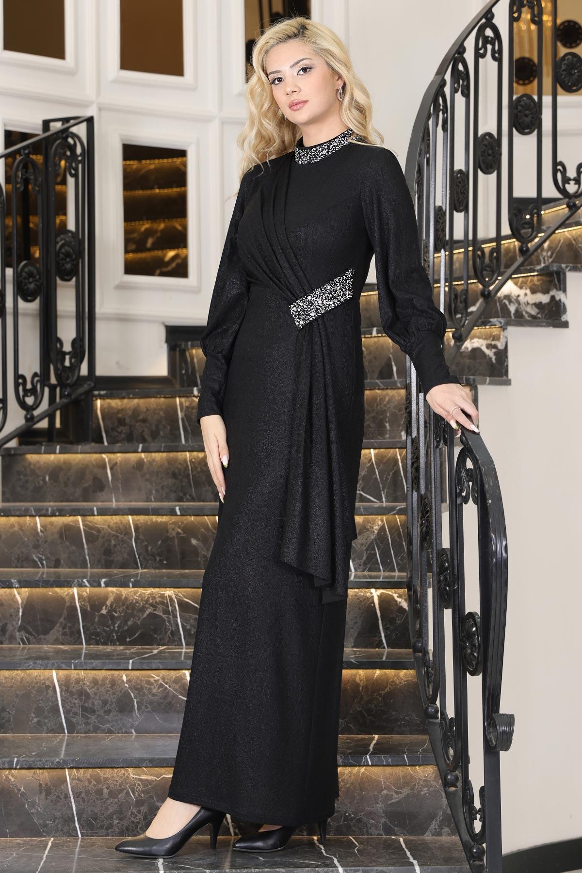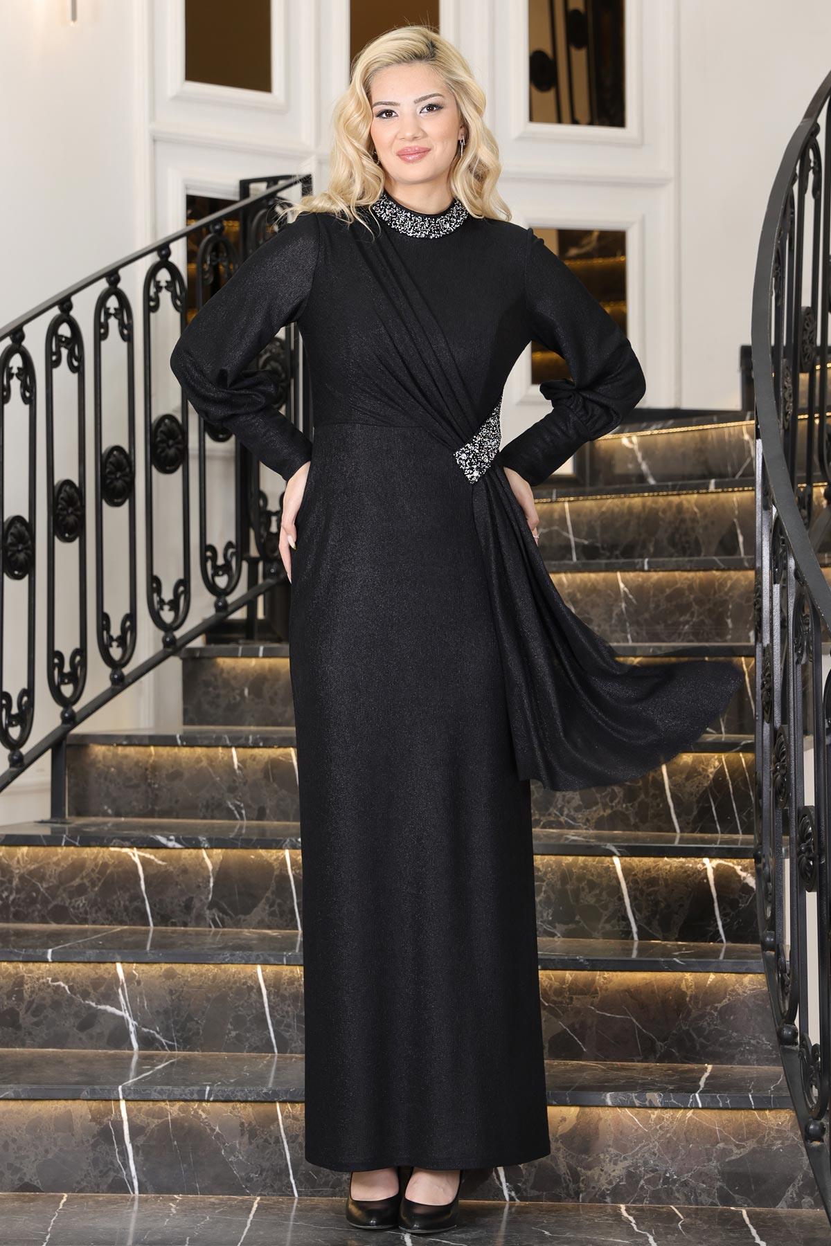 Açelya Sarkaçlı Taşlı Abiye Elbise Siyah ELB74 (ELB74-SİYAH)