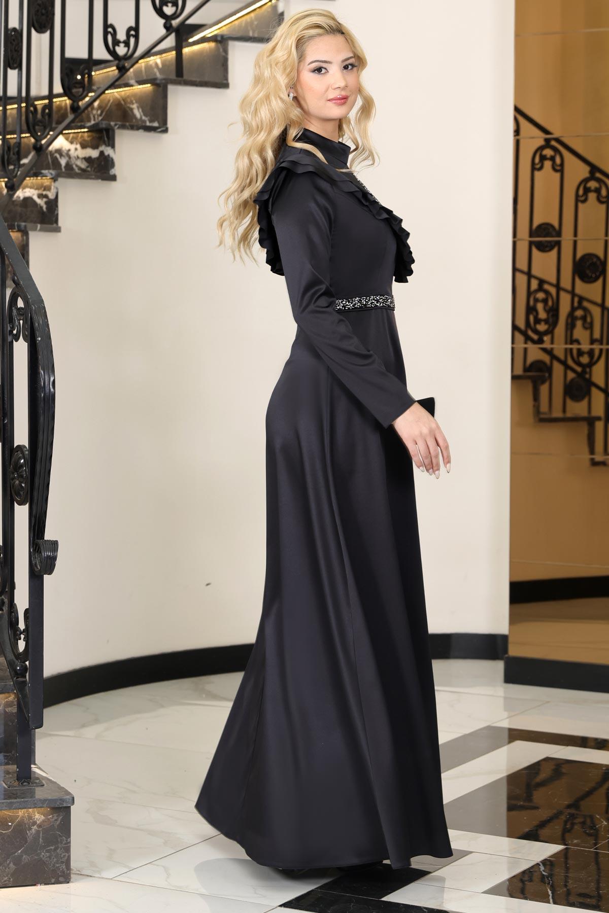 Ada Saten Taşlı Abiye Elbise Siyah ELB72