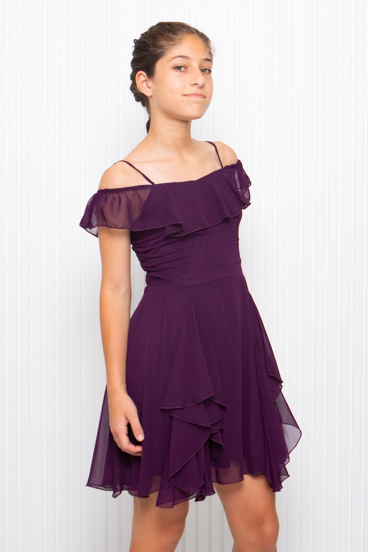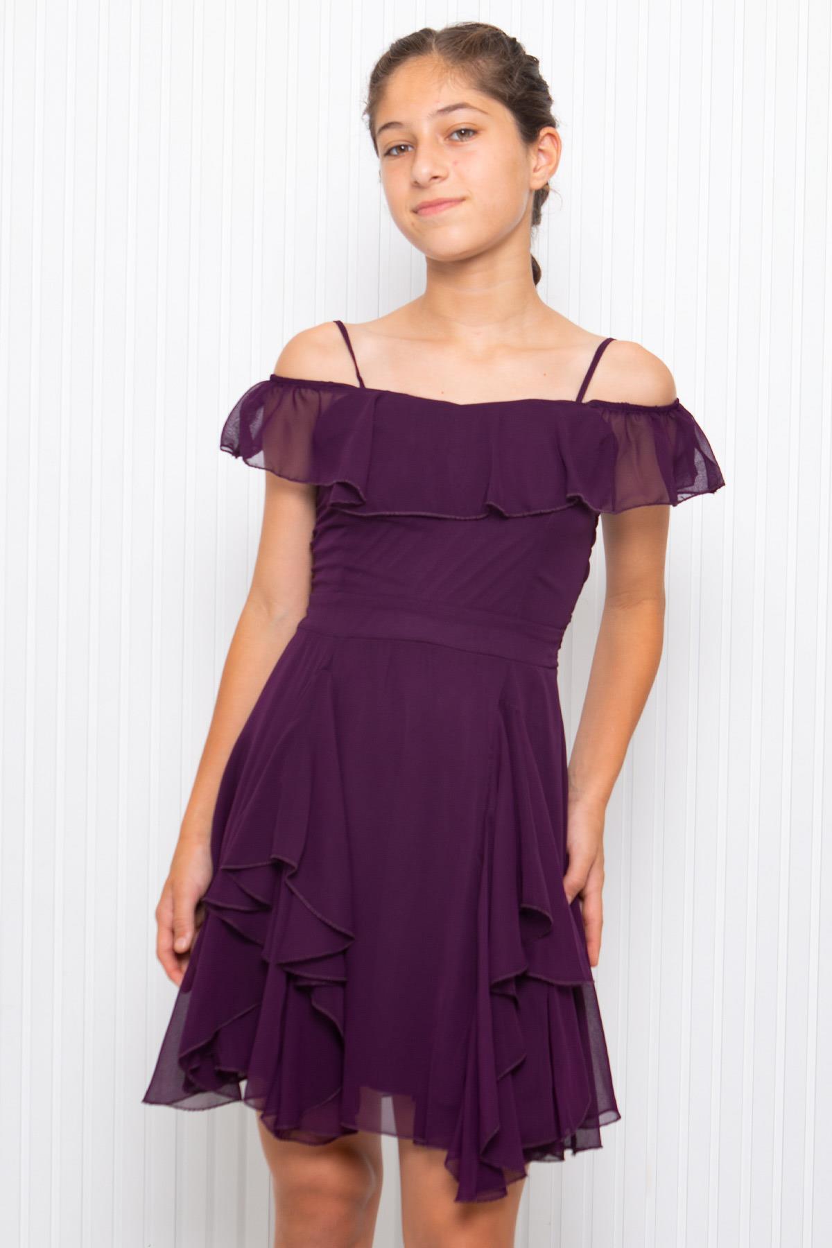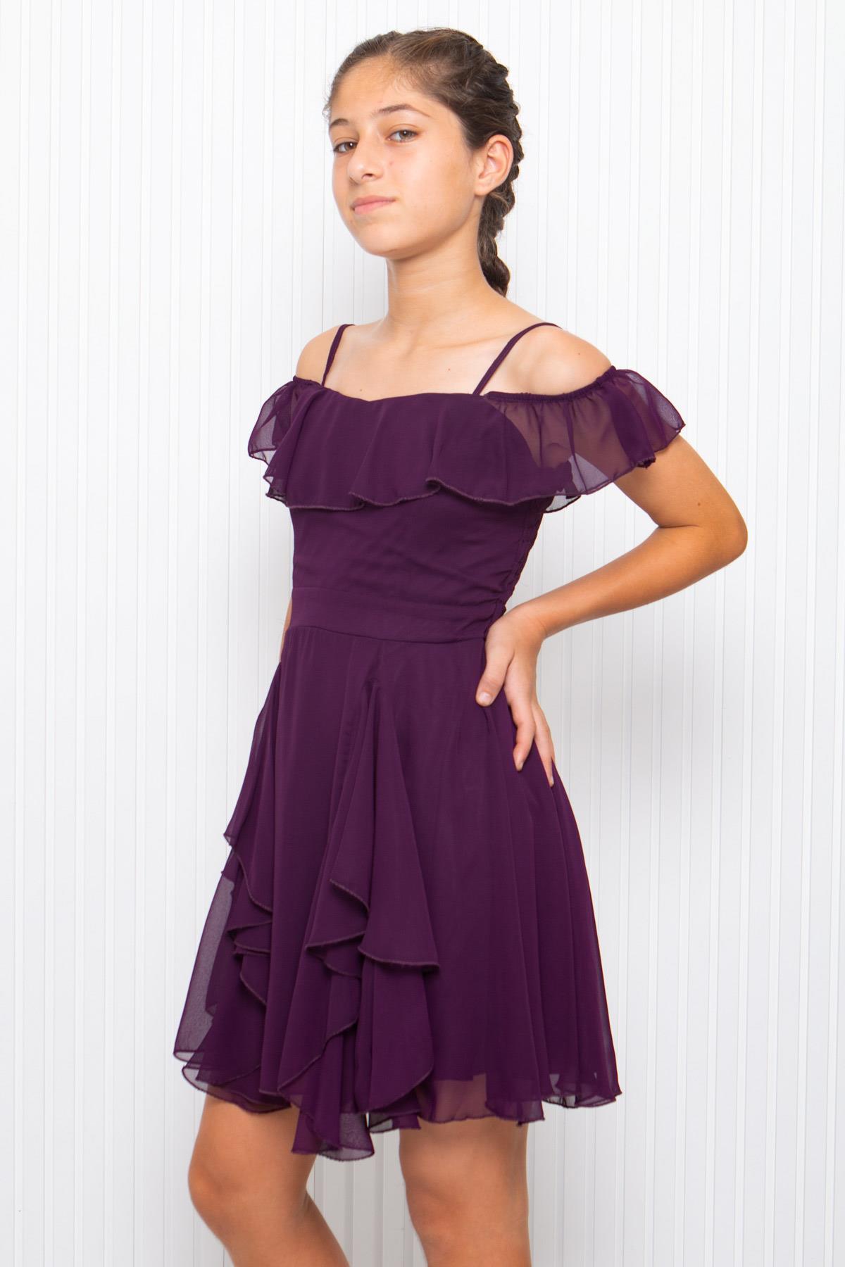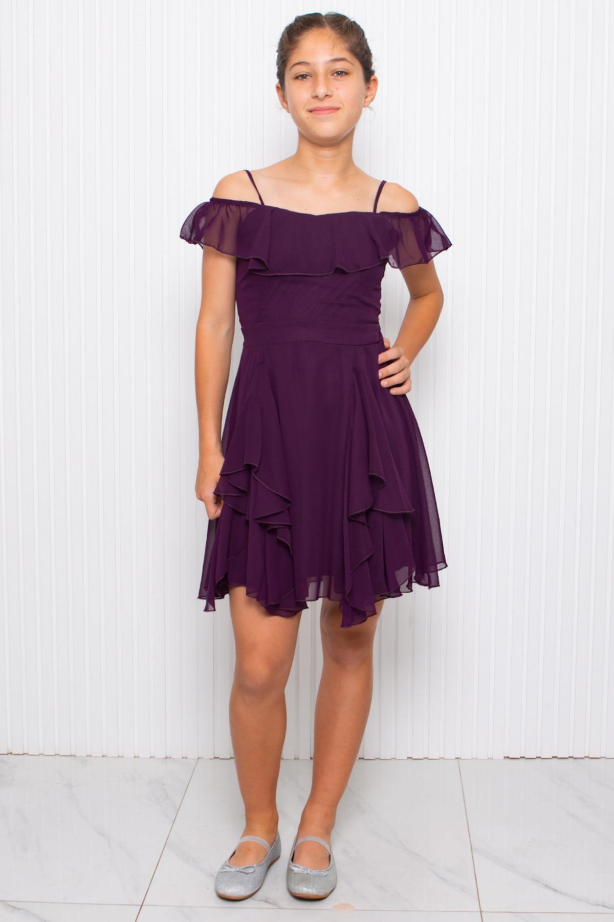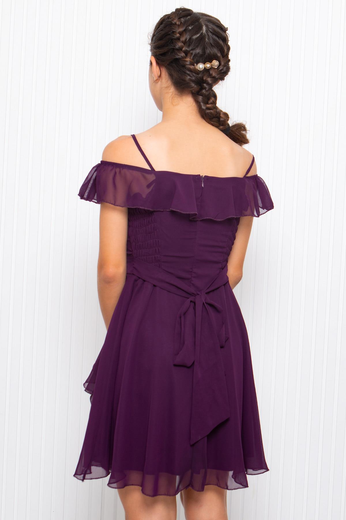 Ürün Özelliği: Hafif esnekliği mevcuttur. Fırfır detaylı şifon elbise . Arkadan fermuar detaylıdır. Omuzdan boy 80 Esnek göğüs 77 Esnek bel 65