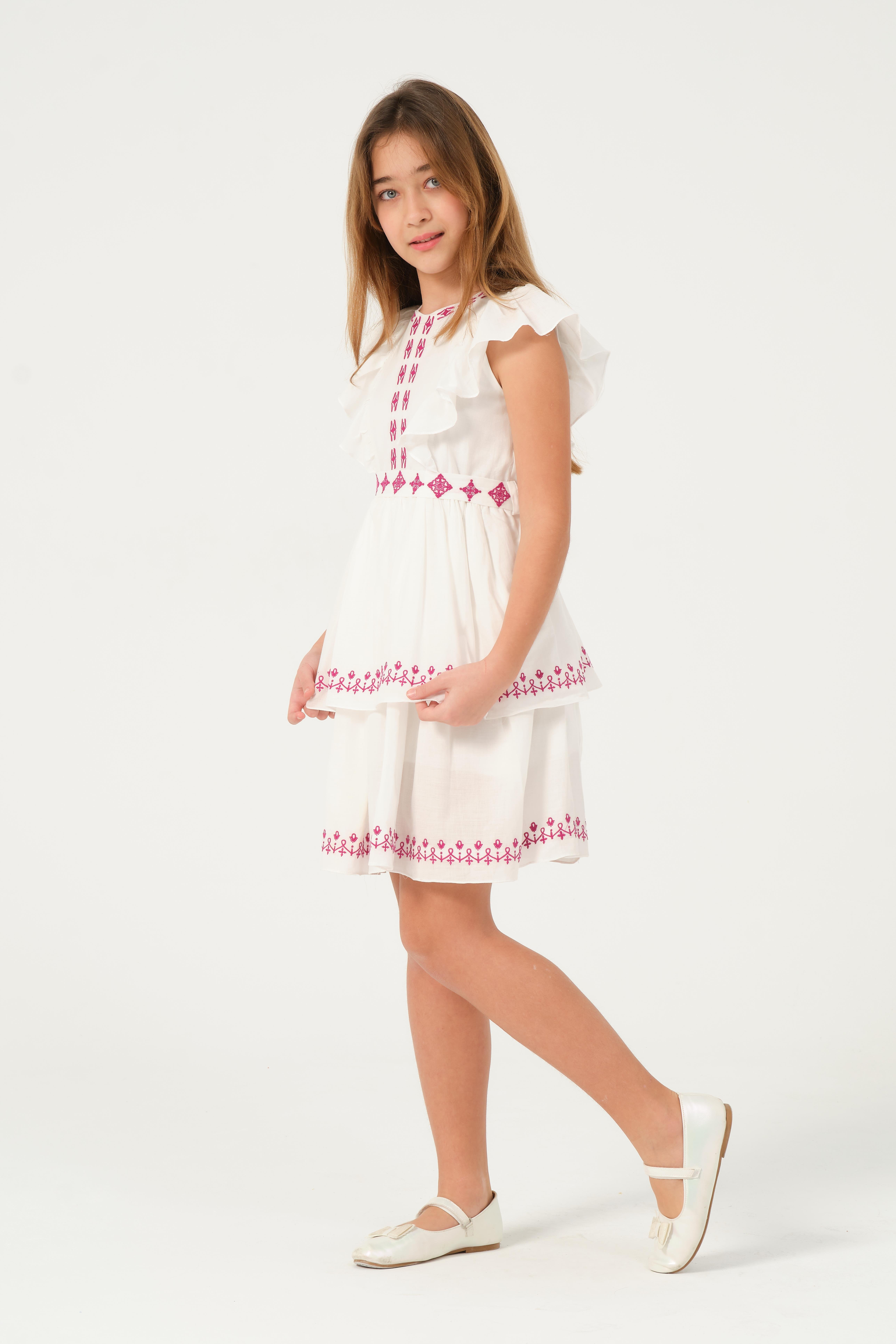 KIZ ÇOCUK VOLANLI YAKA DETAYLI NAKIŞLI ELBİSE