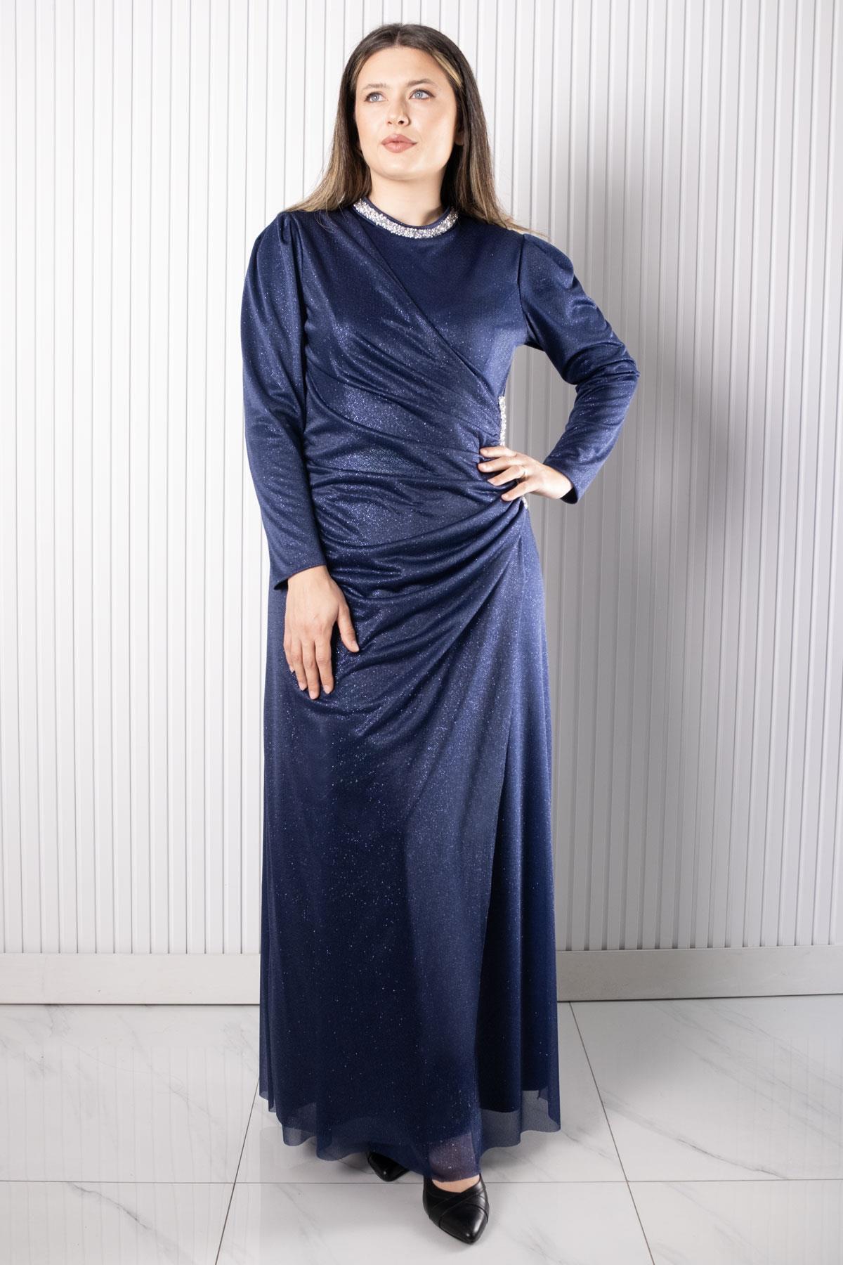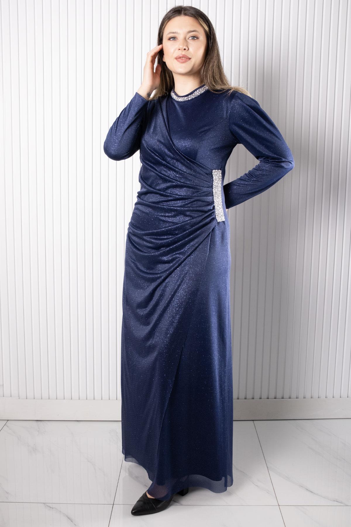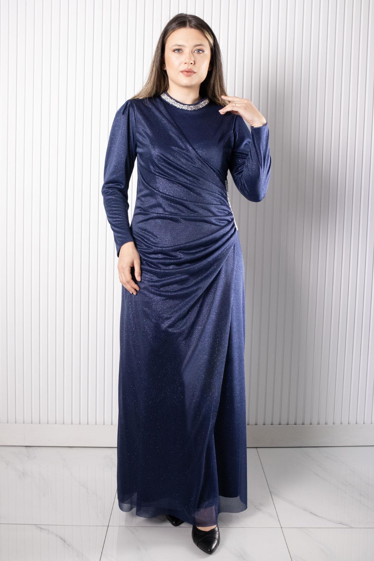 Taş Baskılı Simli Tül Abiye Elbise (FHM956-Lacivert)