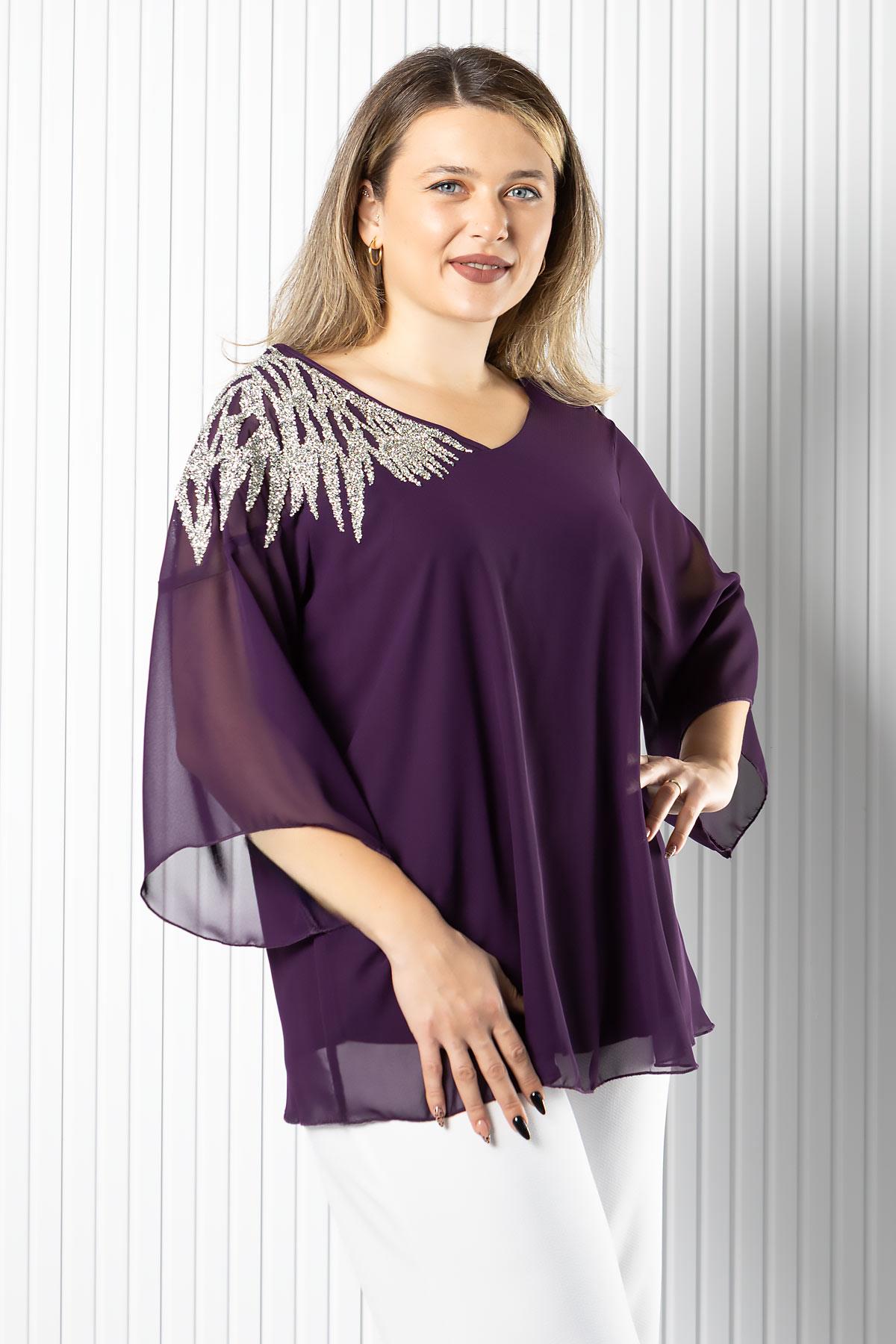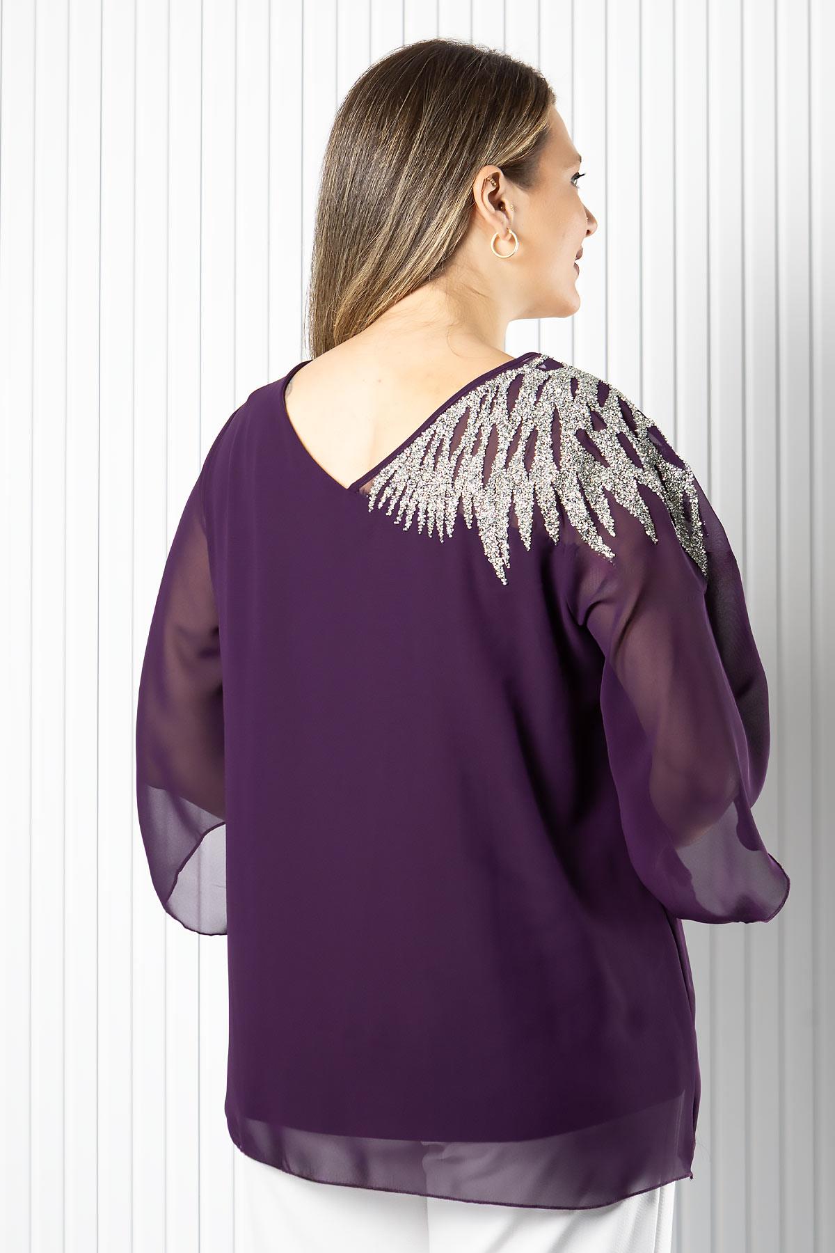 Tek Omuz İşlemeli Şifon Bluz (MDV972-Mor)