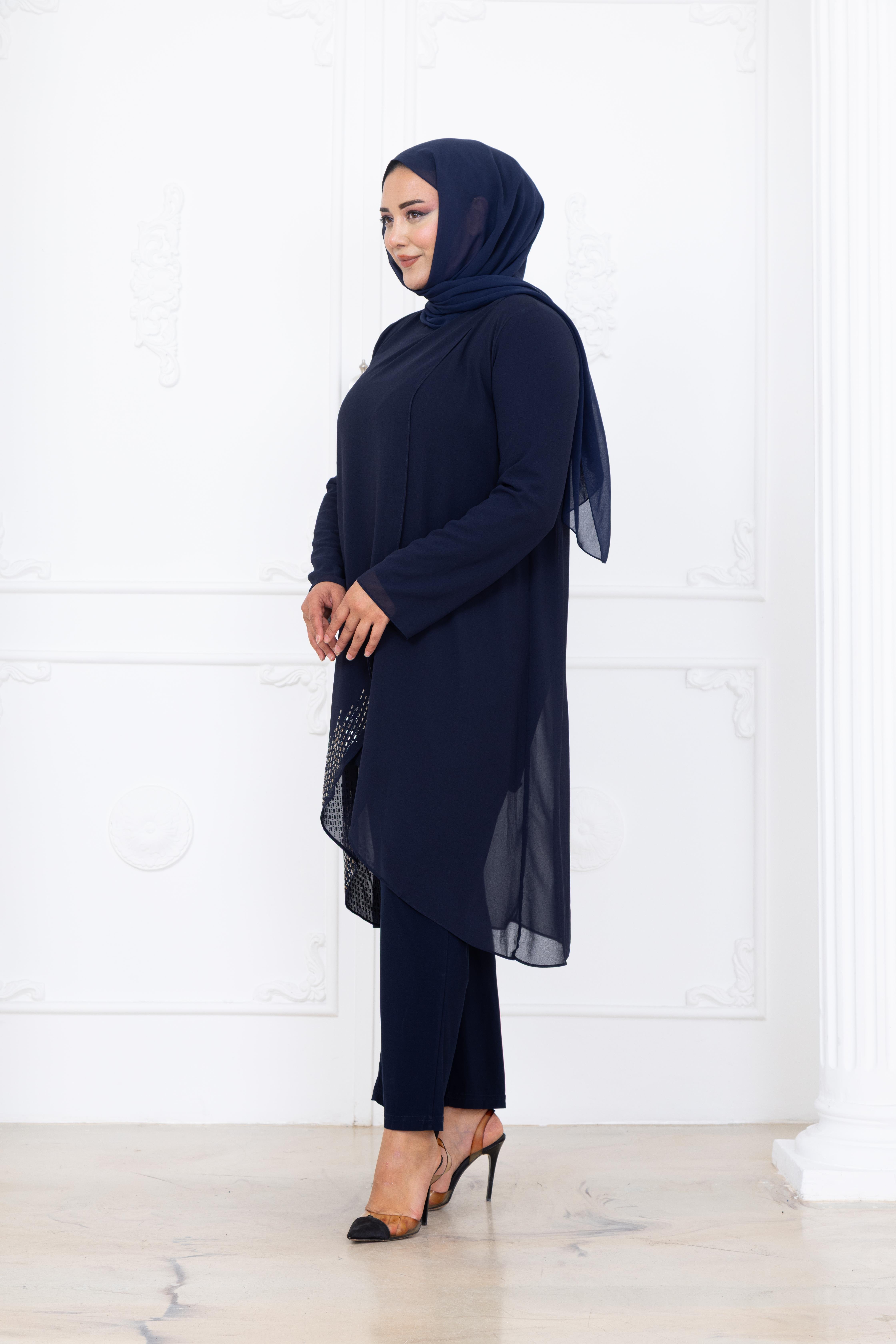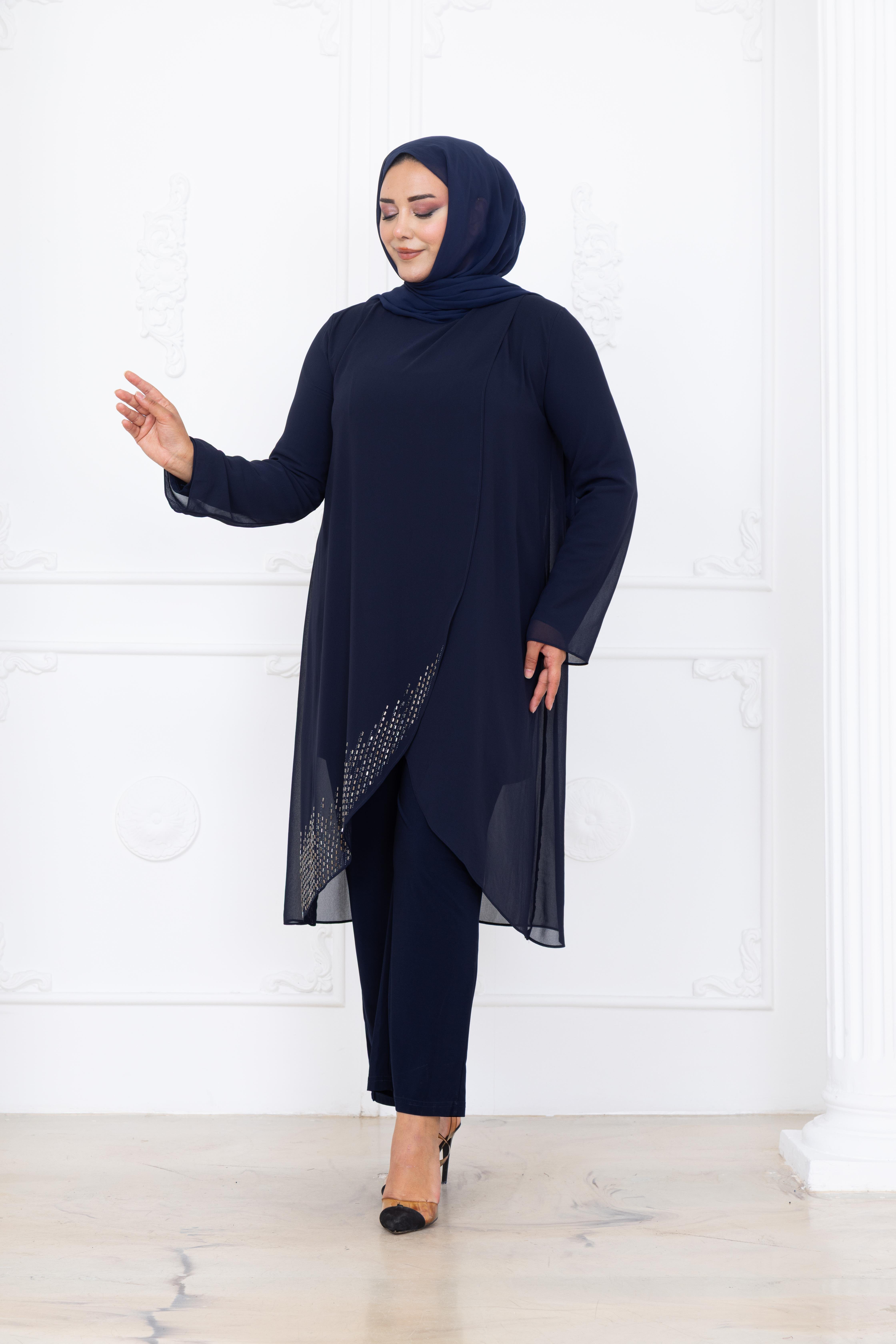 Esin Şifon Taşlı Tesettür Takım Lacivert AMH1082 (AMH1082-LACİVERT)