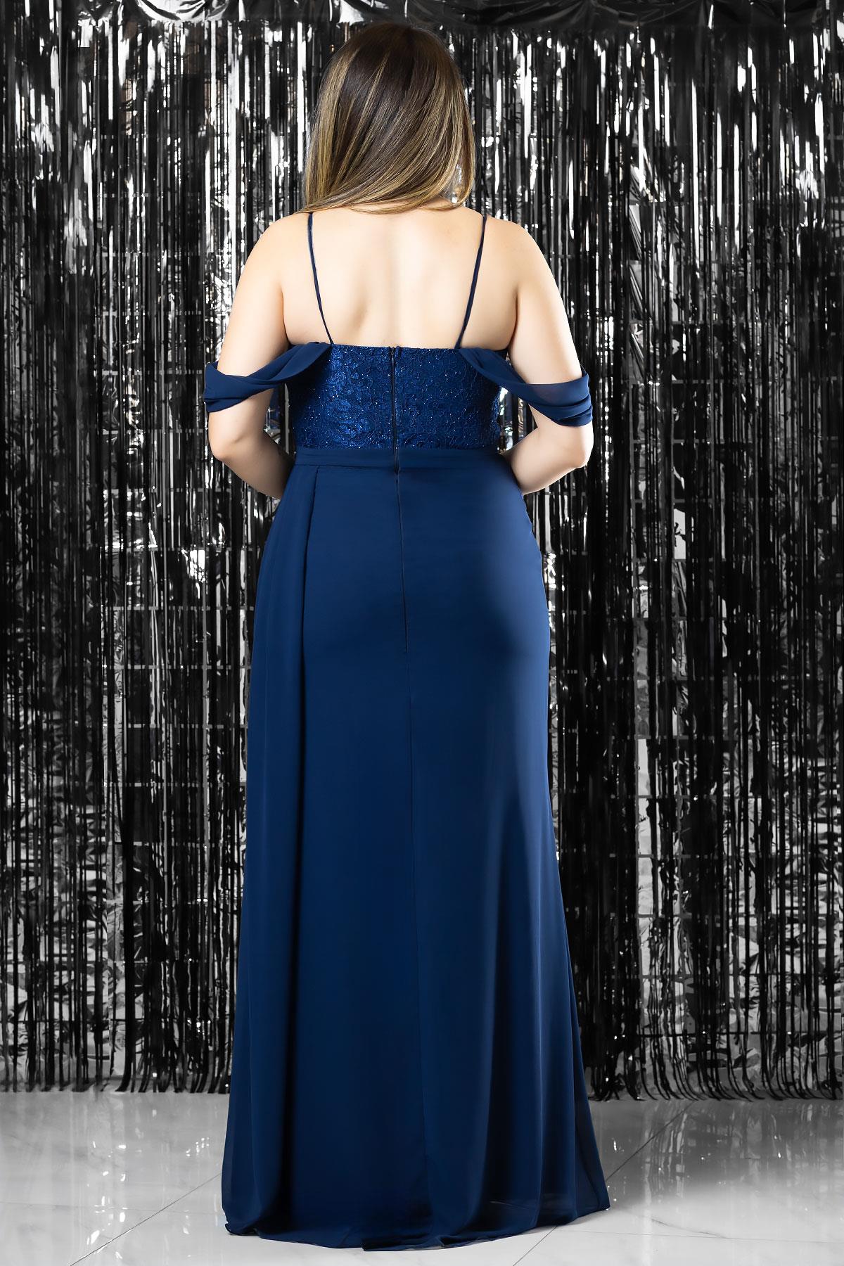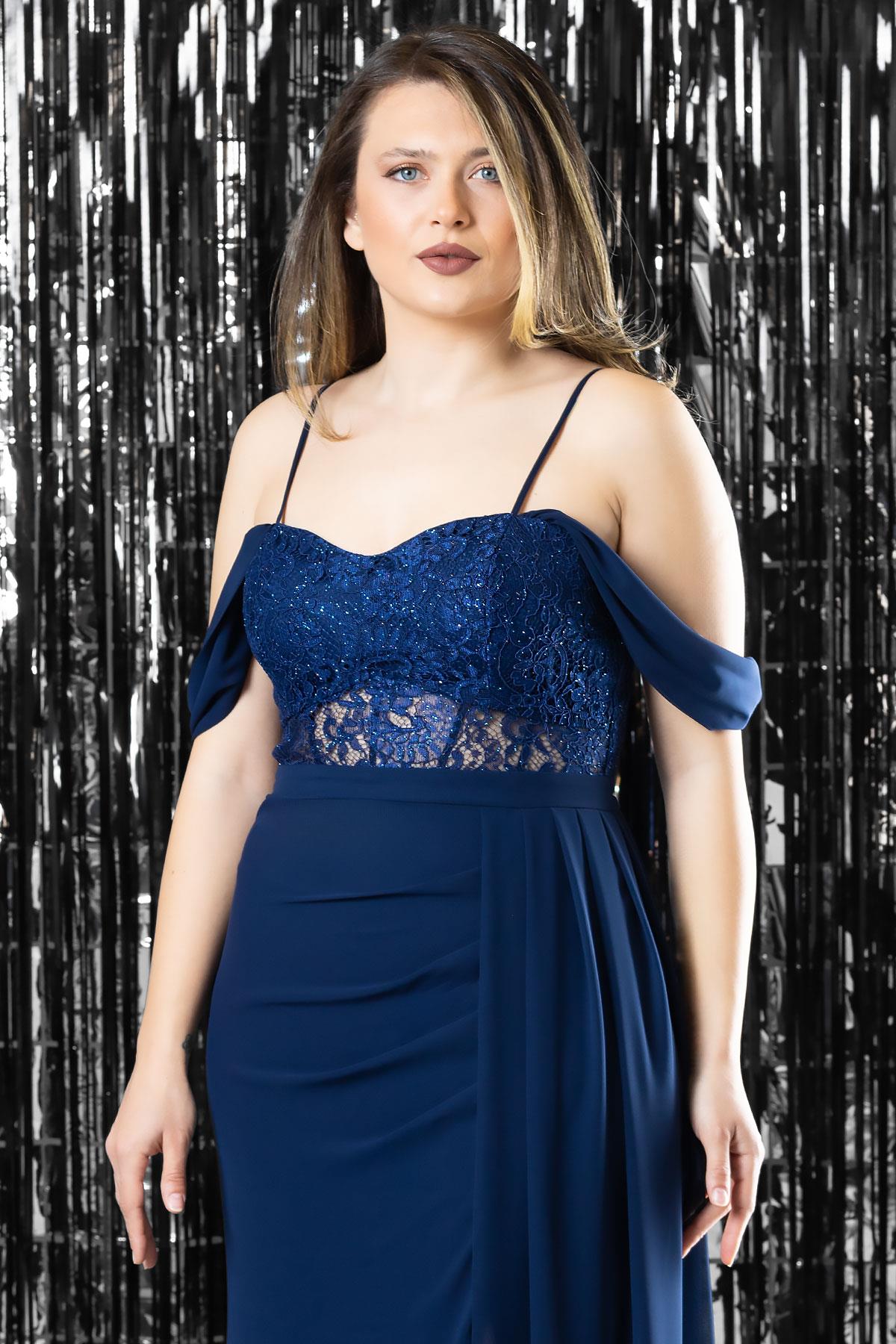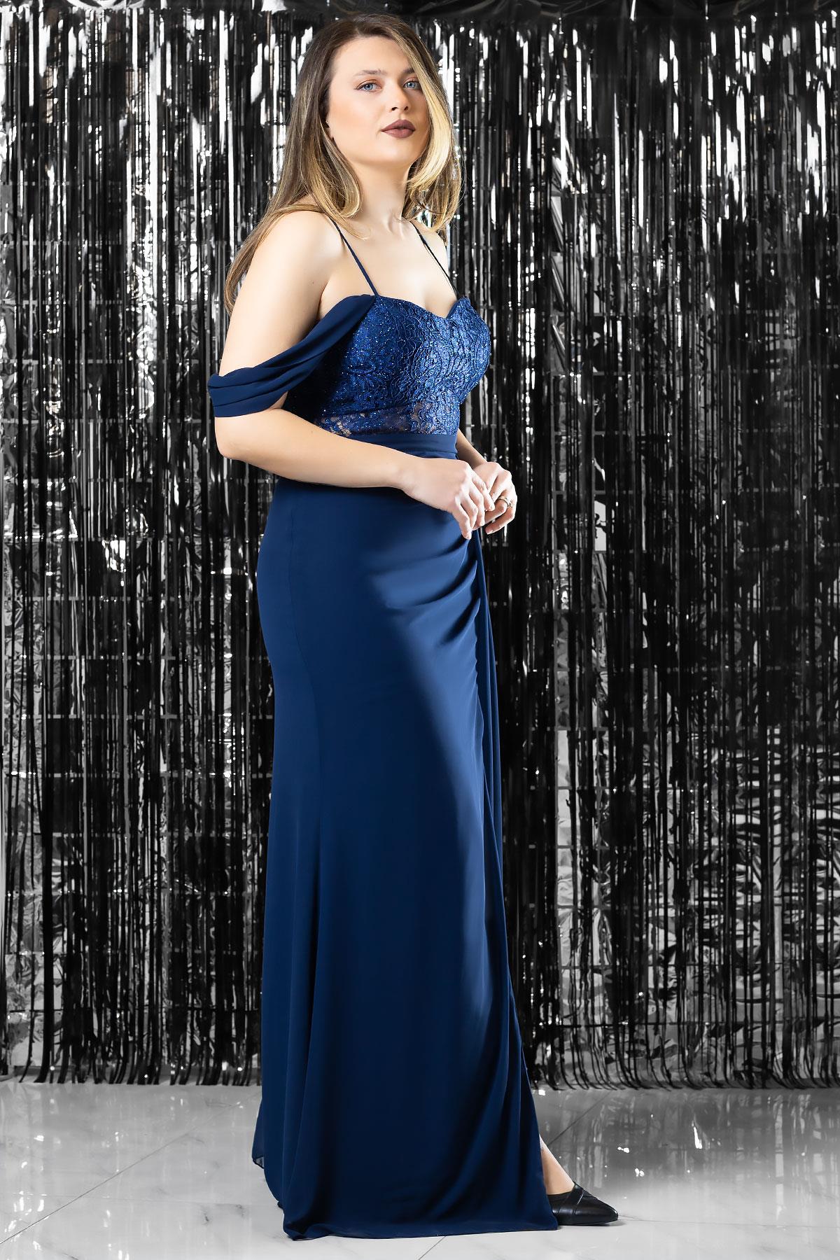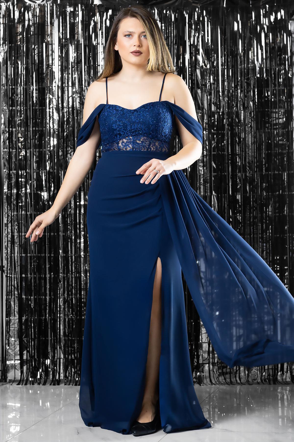 Robe de Soirée à Bretelles et Détails en Dentelle Bleu Marine MDV380 (MDV380-LACİVERT)