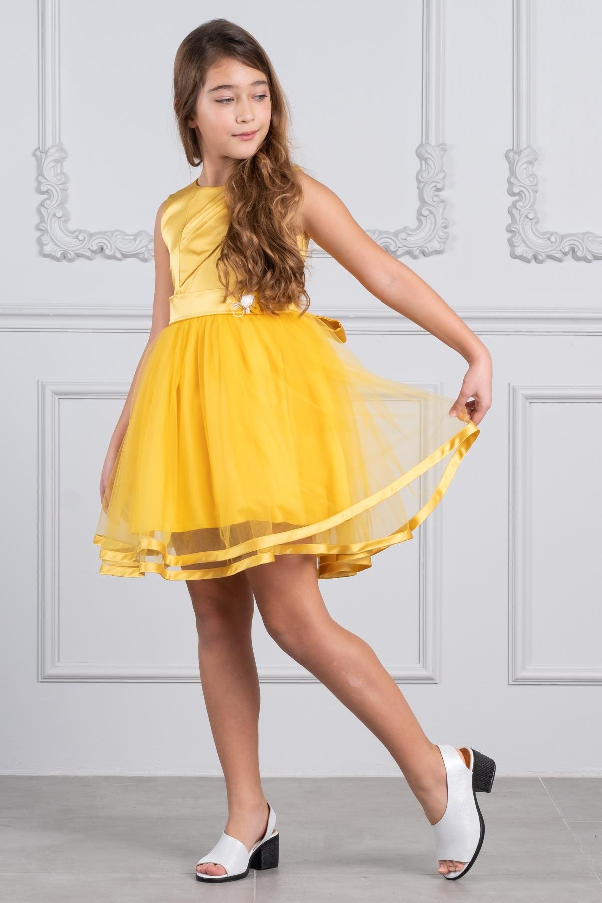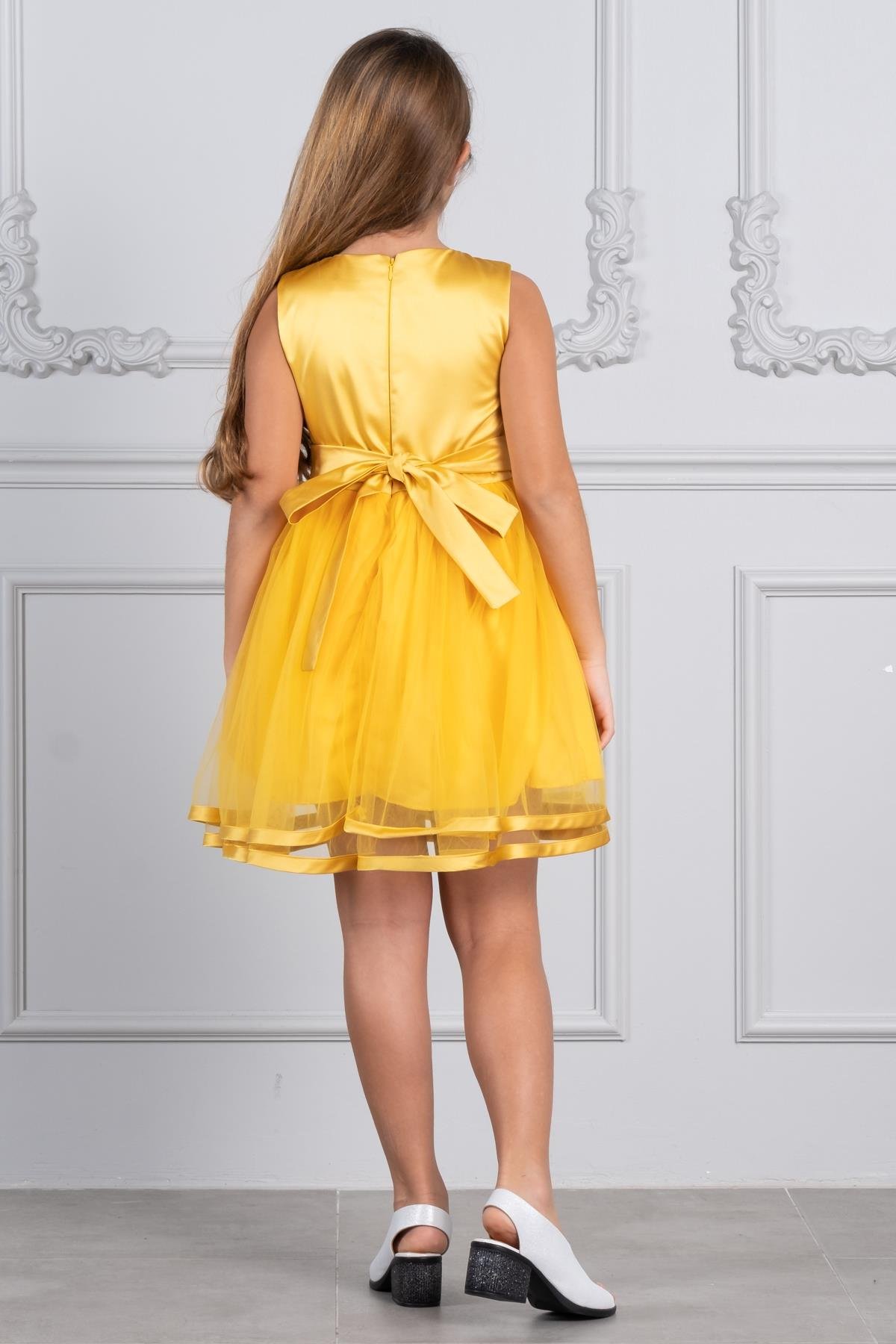Kız Çocuk Saten Ve Tül Abiye Elbise Sarı KVC996 (KVC996-SARI)